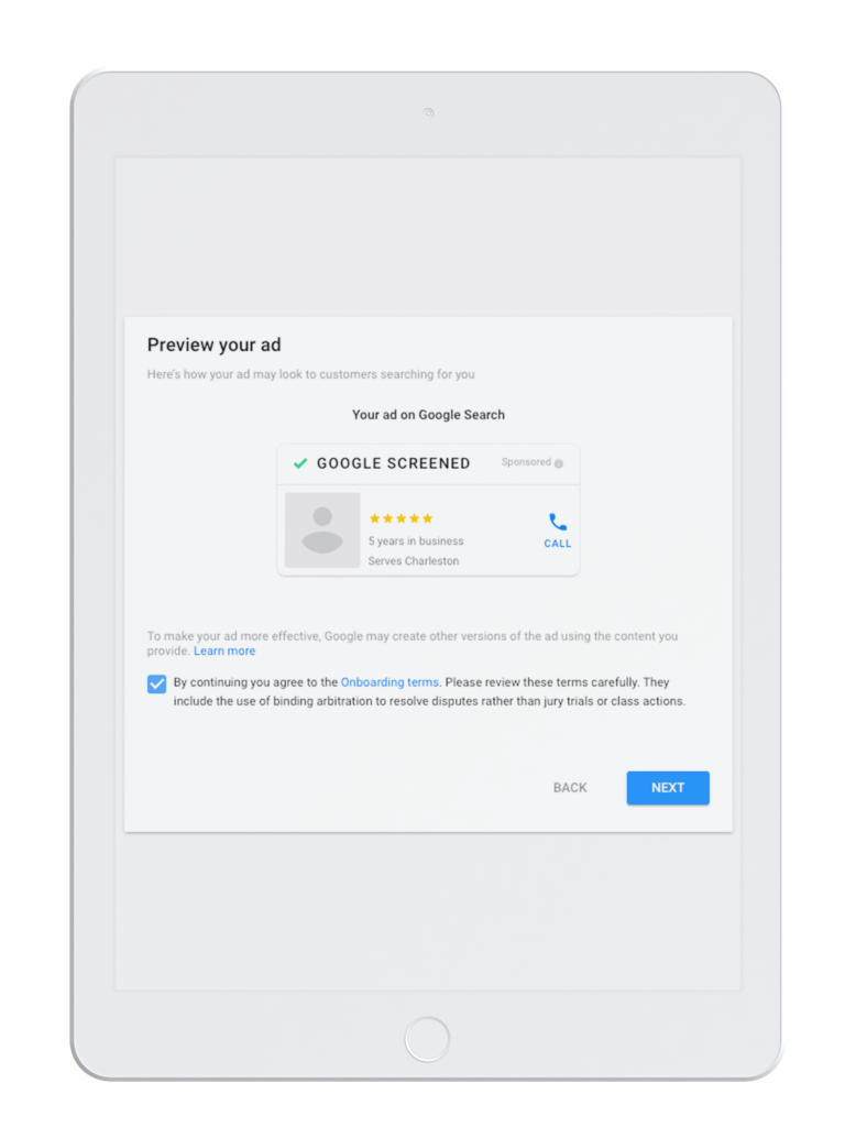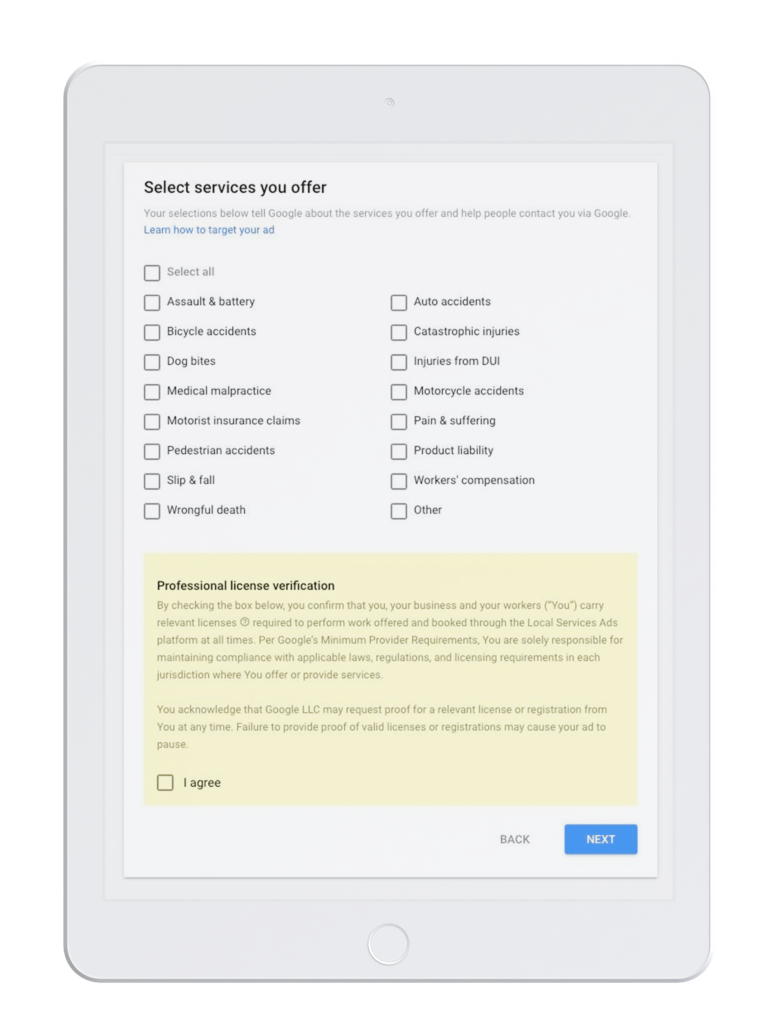 Since Google has to be pre-vetted and verified, the information your law firm needs to fill in goes deeper than Google Business Profile.  In order to continue, your firm will need the Google Screened/Google Guarantee badge. This will show customers they can trust you.